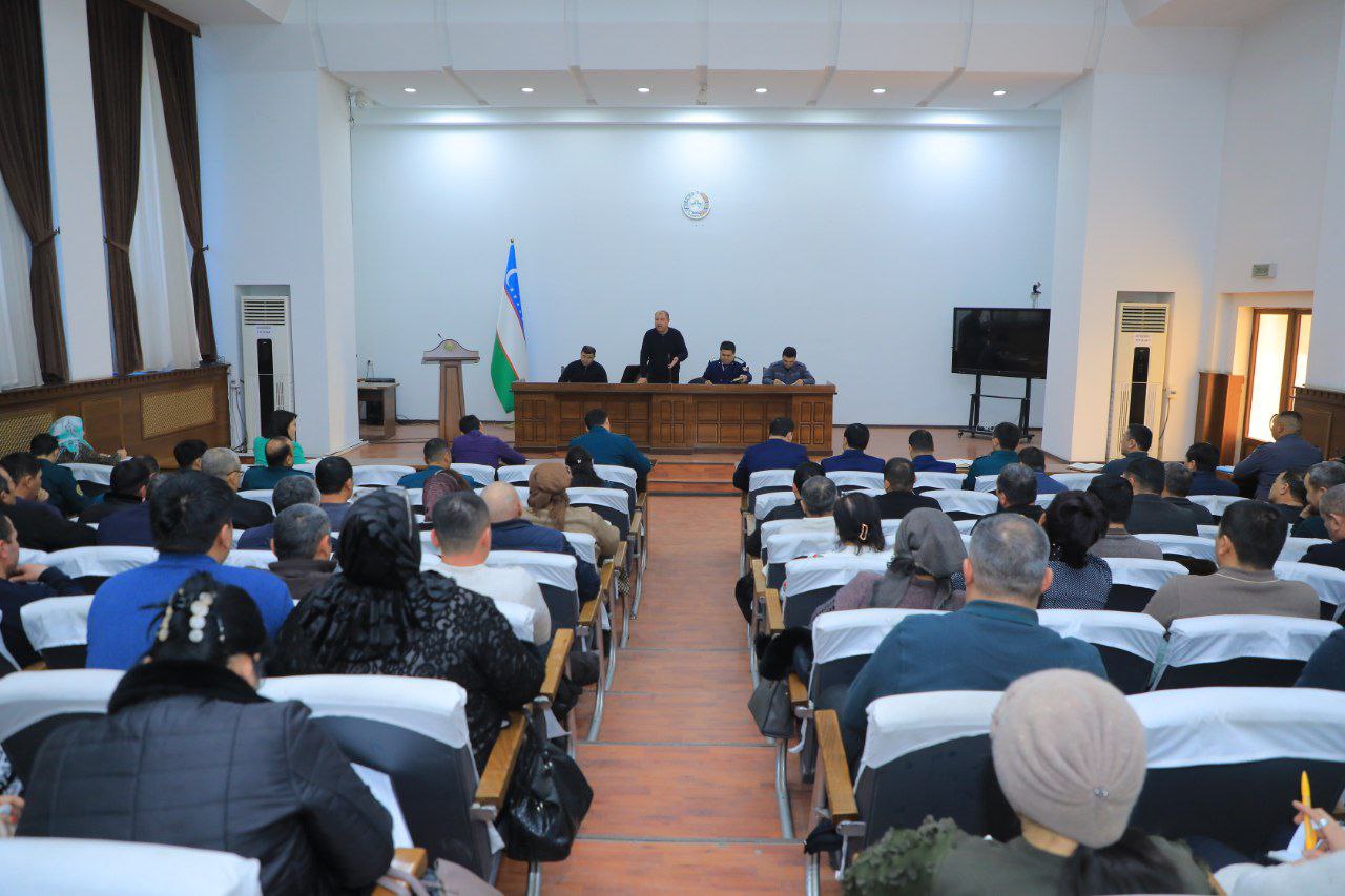 Йиғилишда туман ҳокими Нуршод Худойбердиев, туман прокурори Умид Акбаров, туман ИИБ бошлиғи Ғайрат Ғаниев, вилоят прокуратураси бўлим бошлиғи Д.Сайфиддинов ва масъул идора вакиллари иштирок этди.