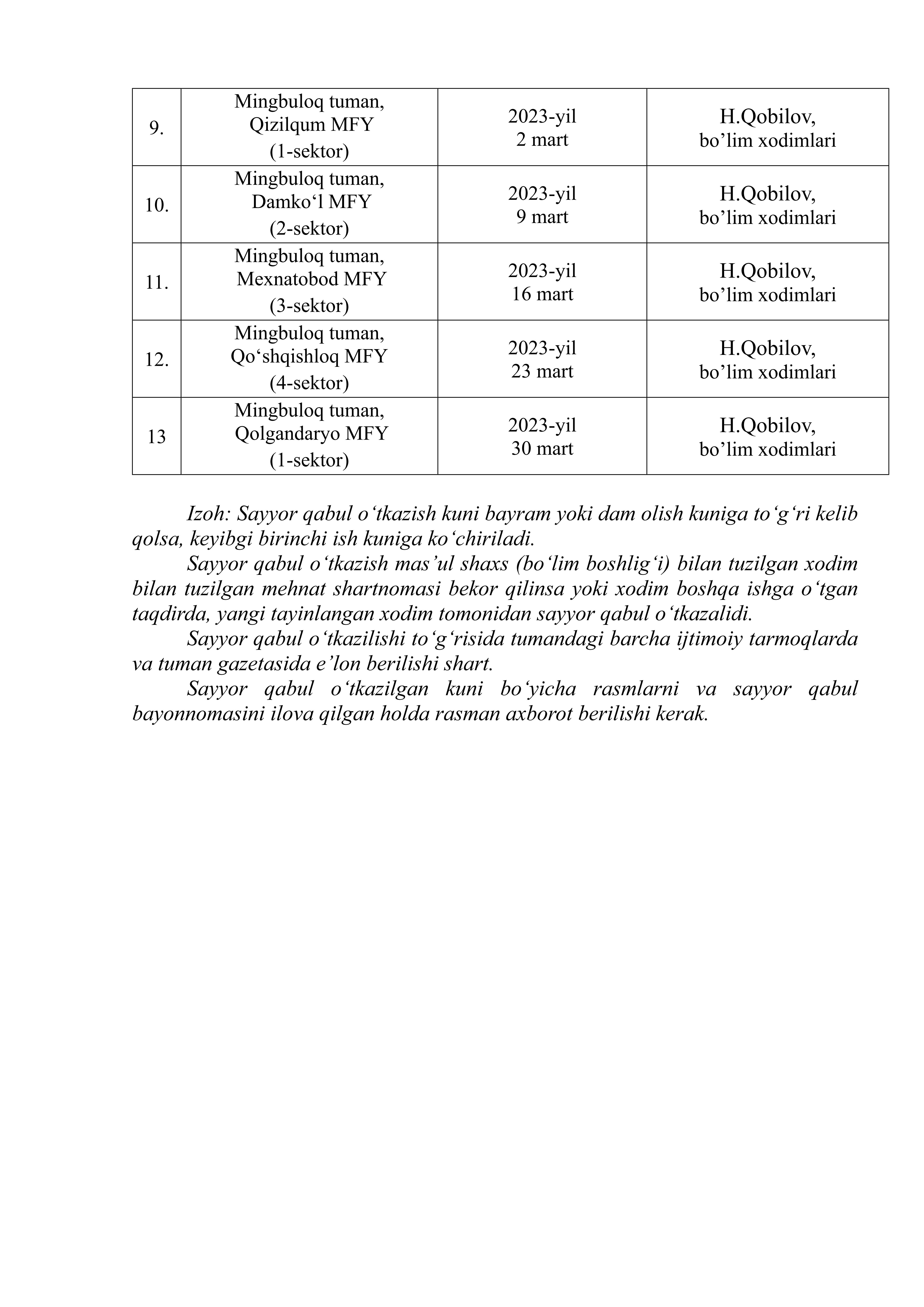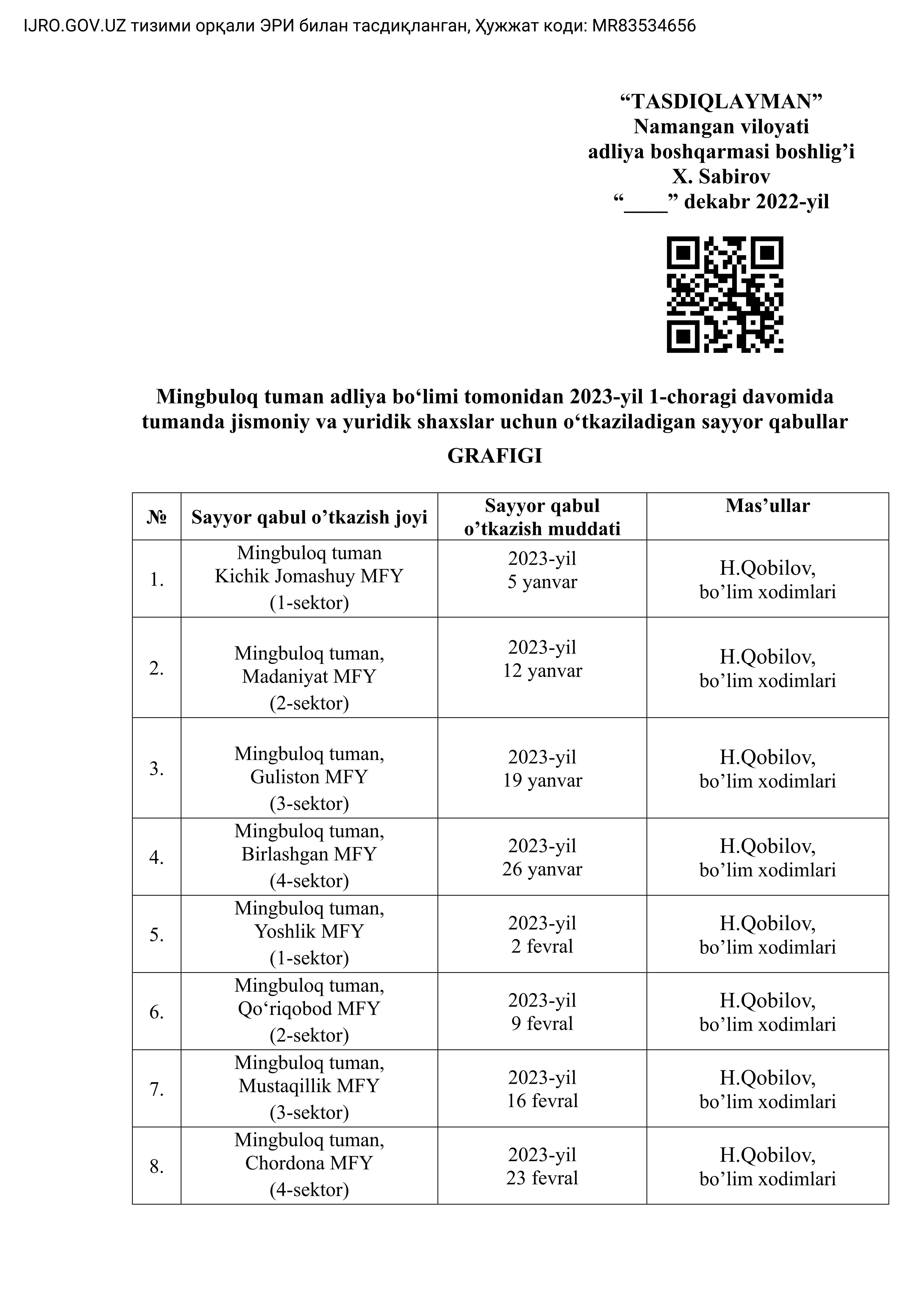 Мингбулоқ туман адлия бўлими томонидан 2023 йил 1-чораги давомида туманда жисмоний ваюридик шахслар учун ўтказиладиган сайёр қабуллар графиги