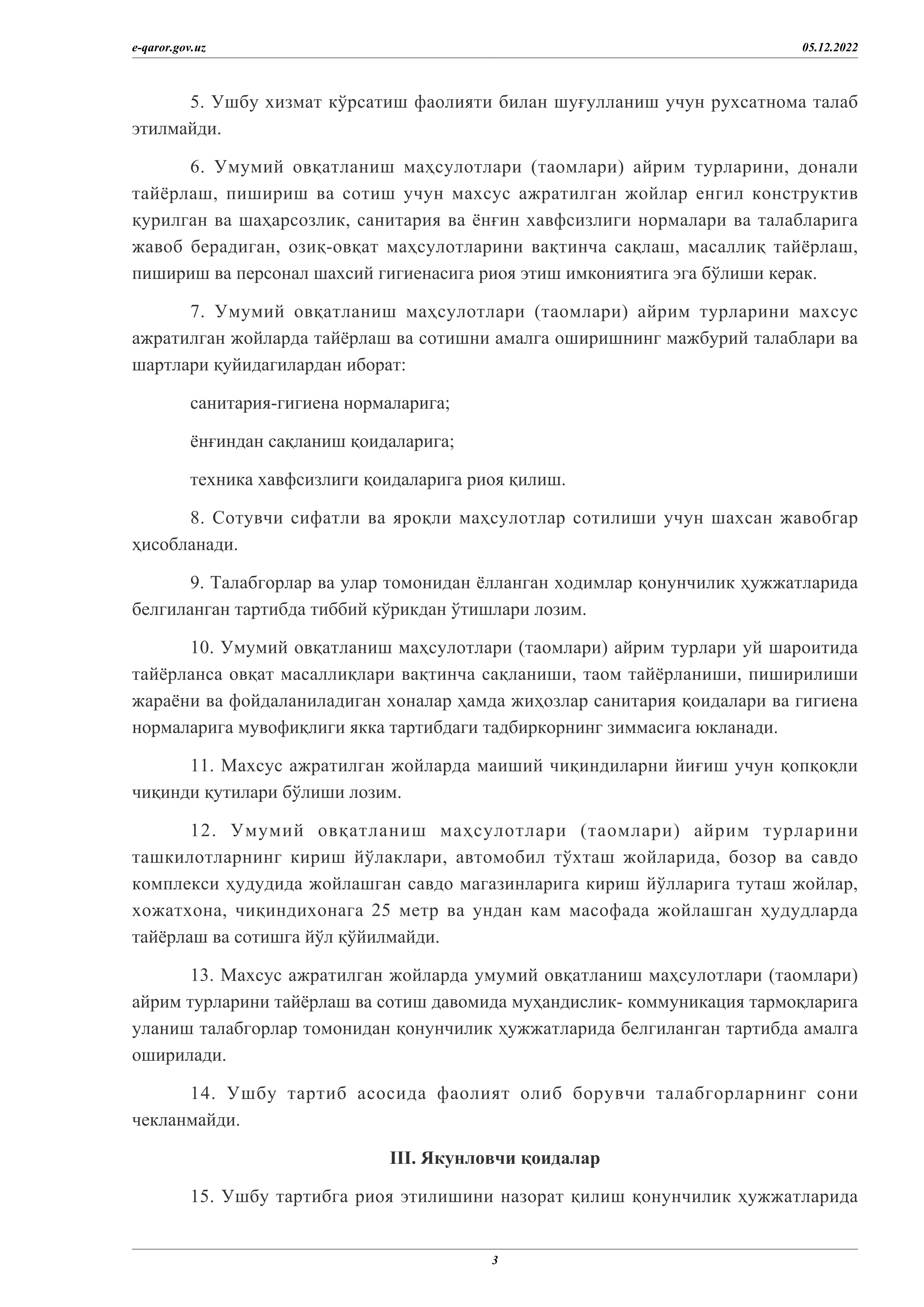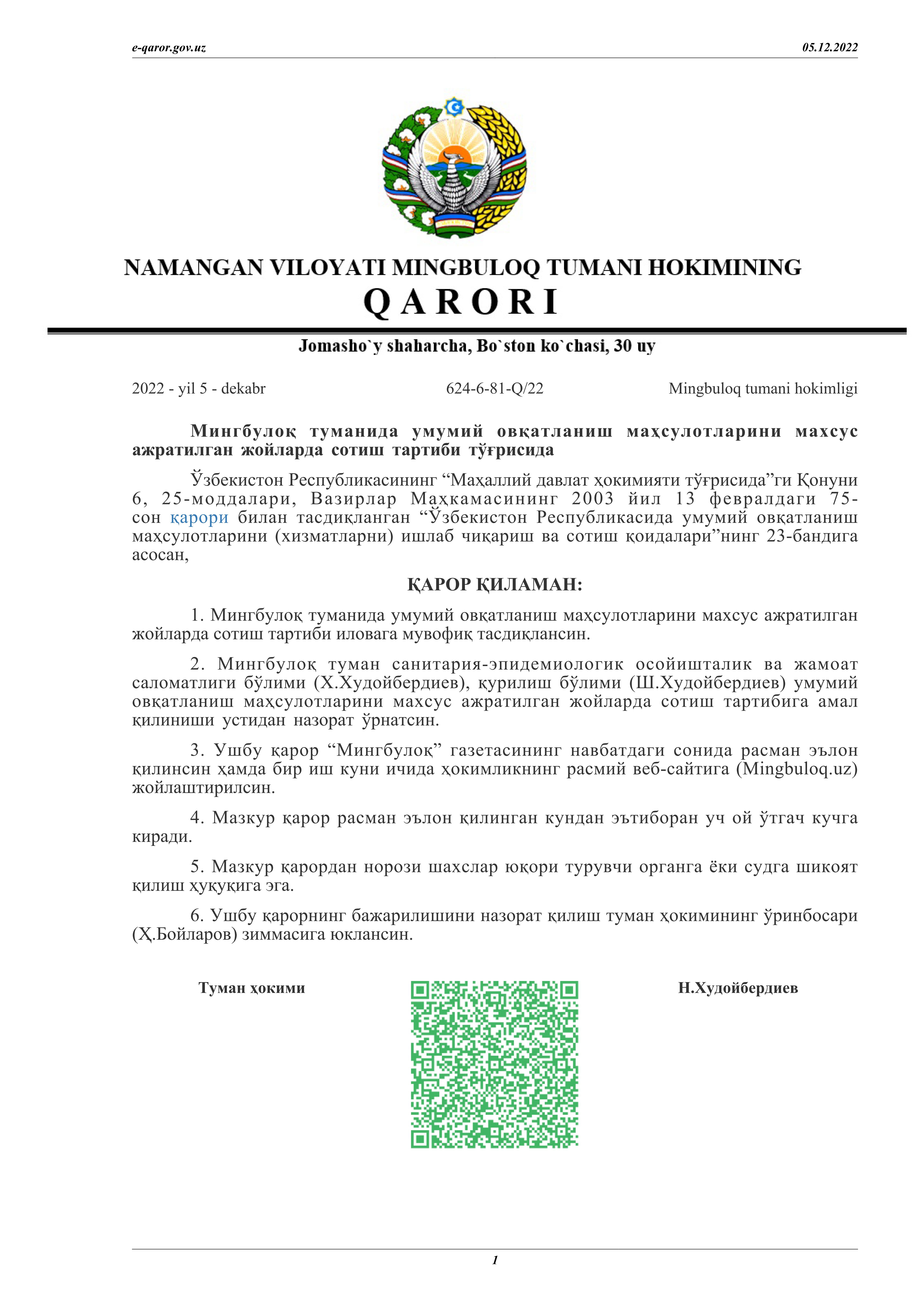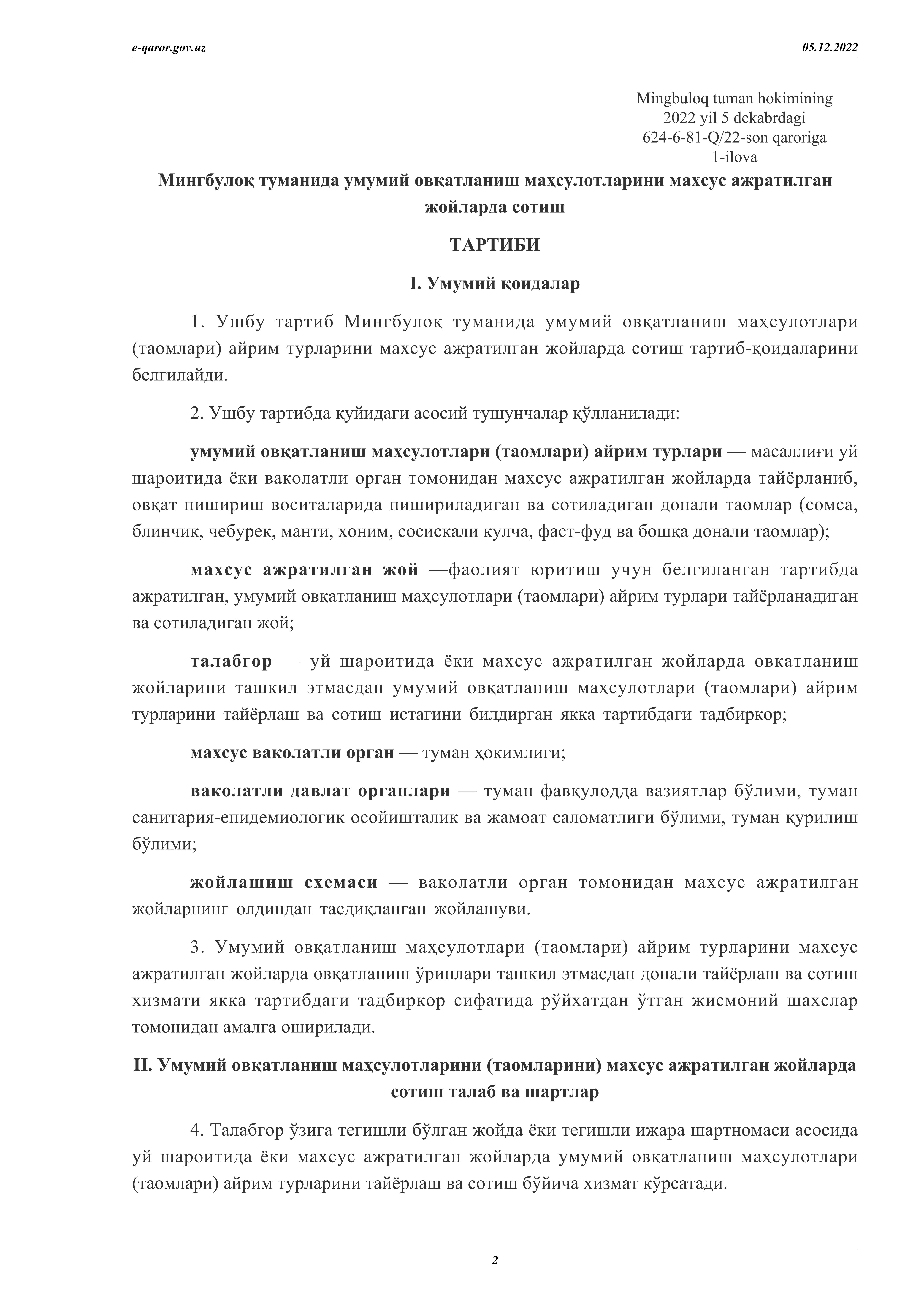 Мингбулоқ туманида умумий овқатланиш маҳсулотларини махсус ажратилган жойларда сотиш тартиби тўғрисида