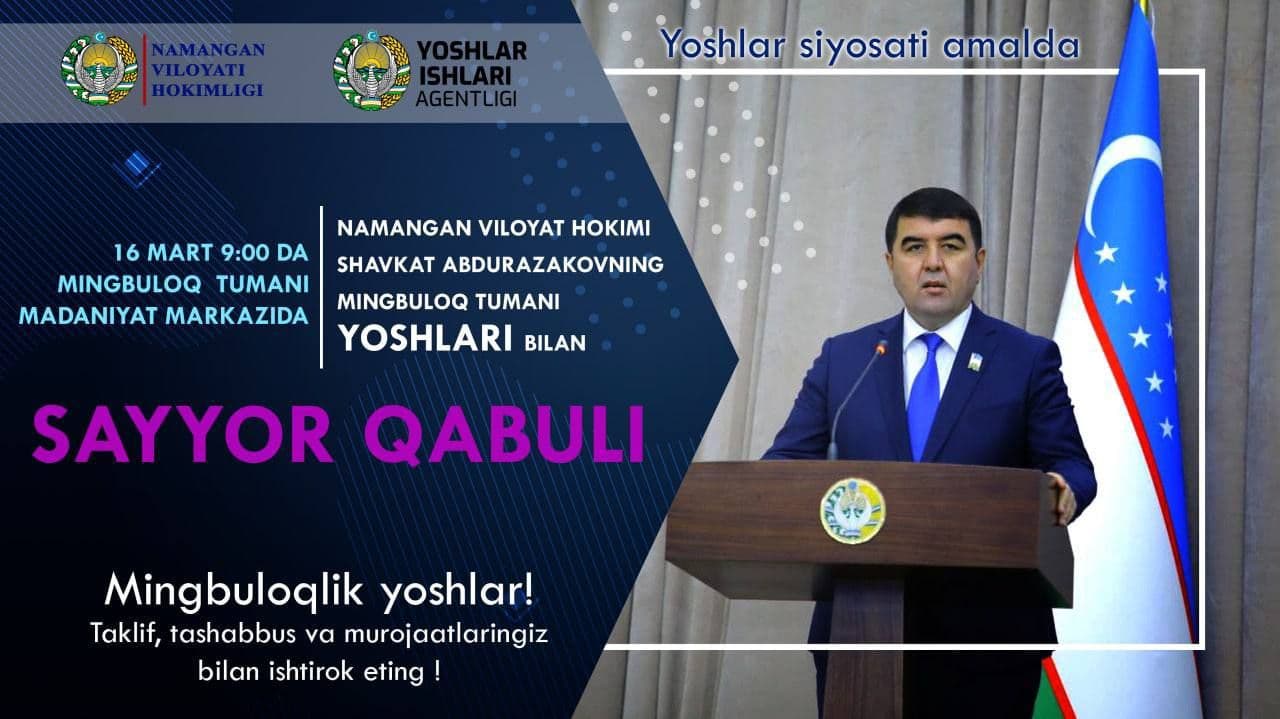 Эртага, 16 март куни соат 9:00 да туман маданият марказида вилоят ҳокими билан ёшлар учрашуви ўтказилади.Учрашувда иштирок этувчилар ушбу рақам билан боғланиб рўйхатдан ўтишингиз сўралади.